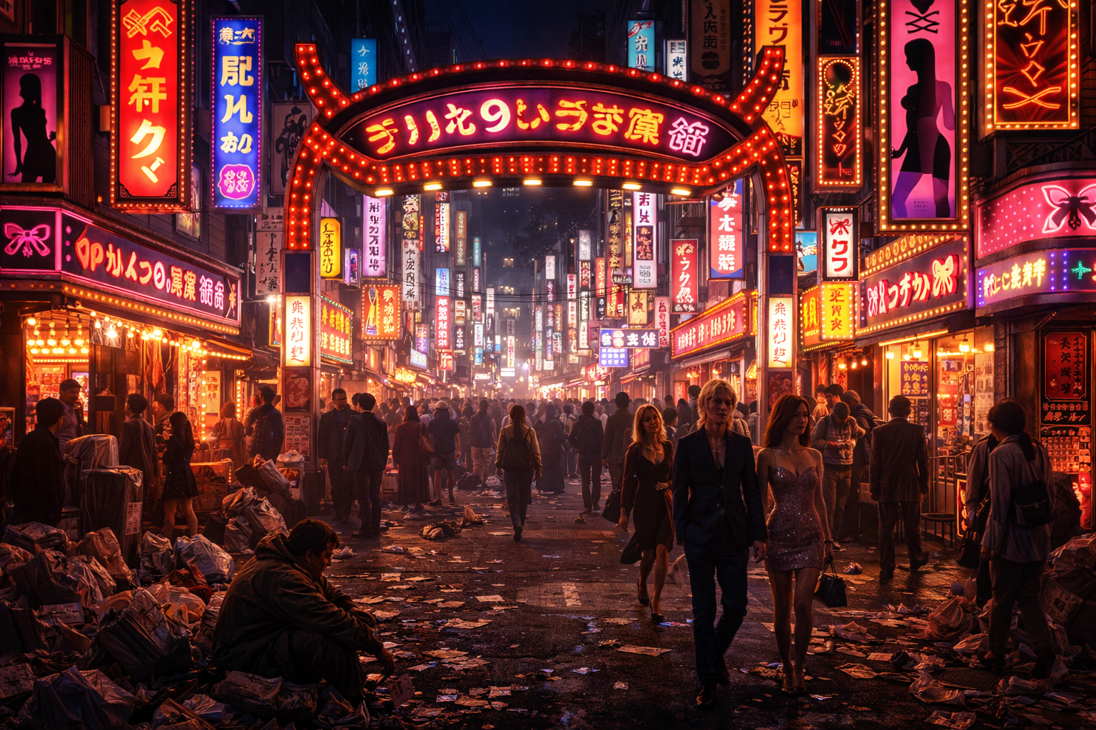 さまざまな人が雑多な歓楽街に集結していますね