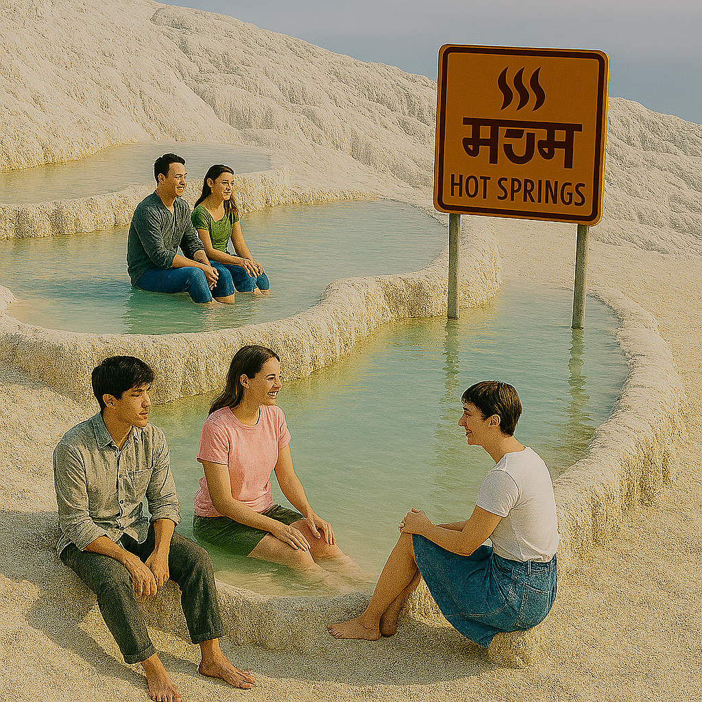 温泉の空の反射が綺麗な、みなさんの楽しい時間ですね